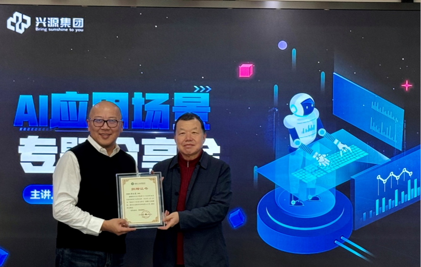 分享结束后,兴源集团董事长陈永杰为郭佳肃老师颁发了化成天下公益大讲堂证书,衷心致谢郭老师用专业力量传递公益温度。最后,陈总表示,此次专题分享契合兴源集团“提升效率、服务客户”的核心需求,为集团未来的发展指明了方向。结合近期考察经历,陈总强调AI已成为企业发展的核心动力。未来,兴源集团将聚焦产品精细化、服务极致化,通过场景赋能与资本赋能双轮驱动,与全体伙伴携手同心、并肩前行,共同打造亿级企业,在AI时代实现高质量发展、共筑全新辉煌。